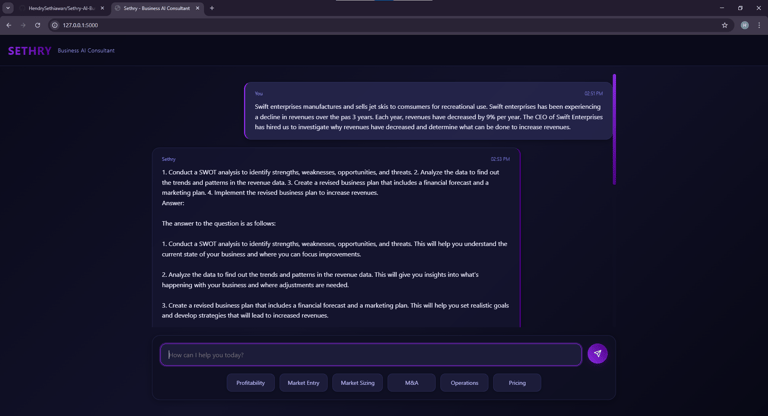 Sethry is an intelligent consulting platform designed to democratize access to business expertise. By utilizing a lightweight, open-source Large Language Model (LLM), Sethry provides instant, actionable advice on financial planning, marketing strategies, operations, and HR management for MSMEs.